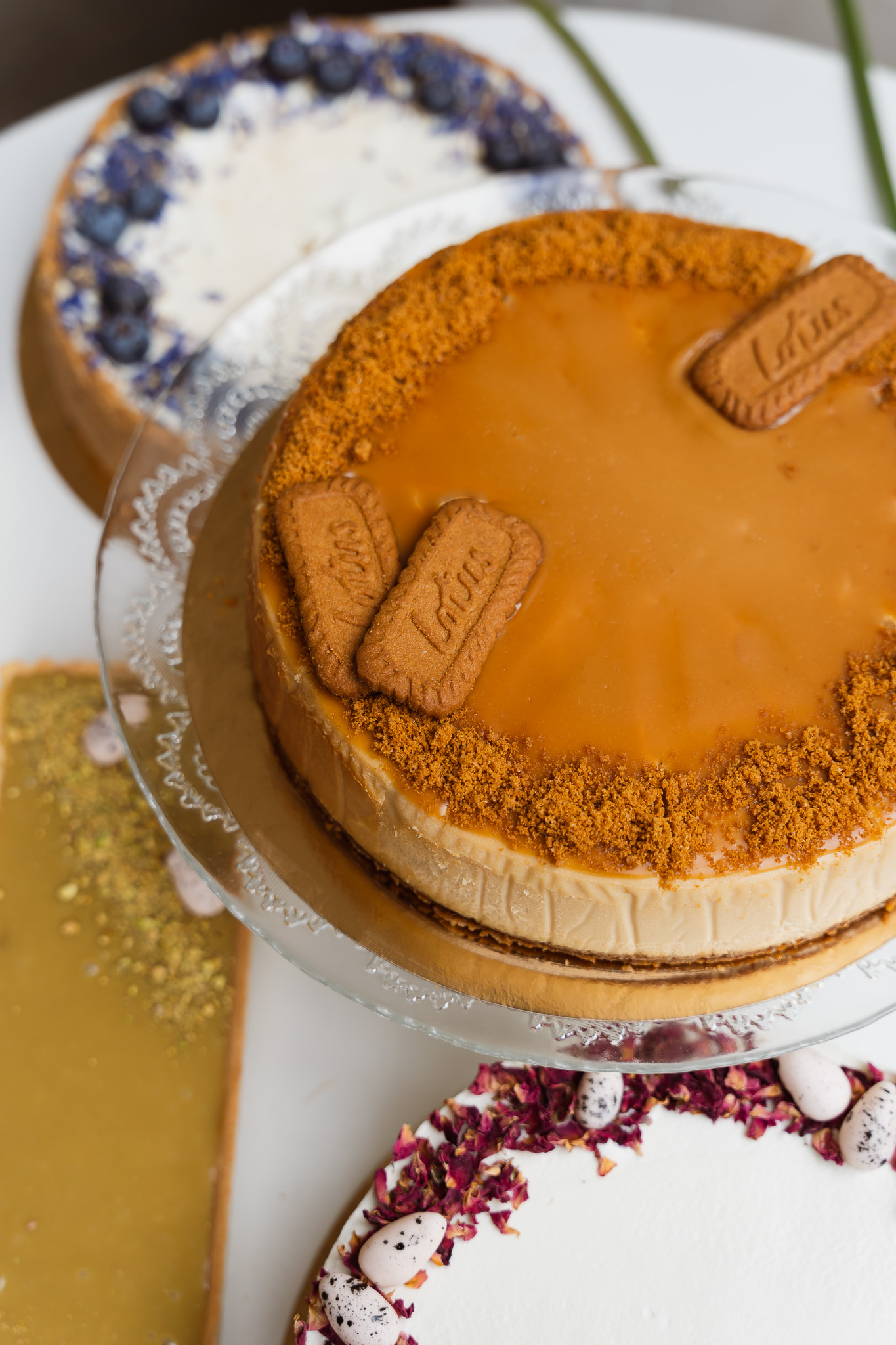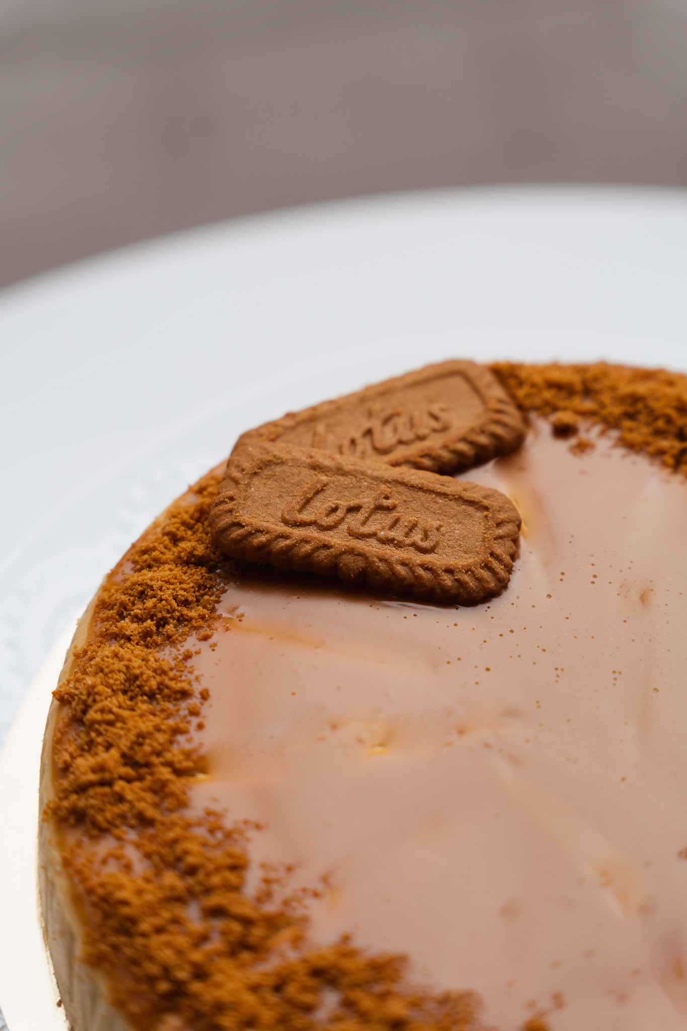 Sernik o smaku ciasteczek lotus na spodzie z ciasteczek lotus i polewą z wielkanocną dekoracją.